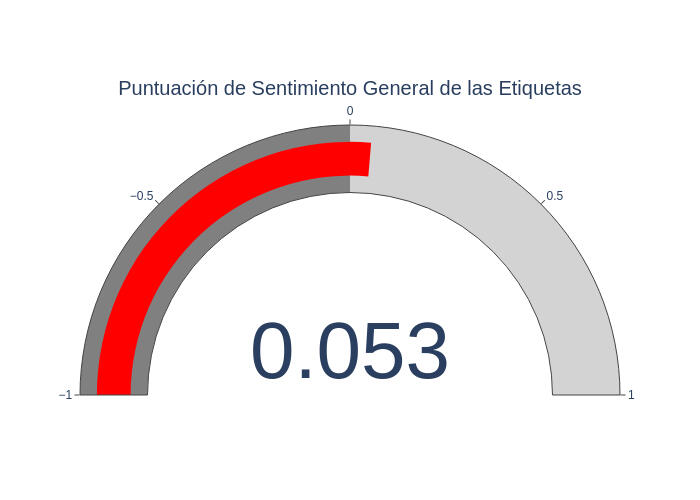 Se ha utilizado la librería TextBlob para calcular la polaridad de sentimiento del total de etiquetas del detaset.Después de calcular la polaridad de todas las palabras, se promedian las puntuaciones de sentimiento para obtener la puntuación de sentimiento general.El resultado impreso en la pantalla muestra la puntuación de sentimiento general de la lista de todas las etiquetas, siendo cercano a cero lo que indica un sentimiento neutral o ambiguo.En este caso, el resultado obtenido es de 0.053.