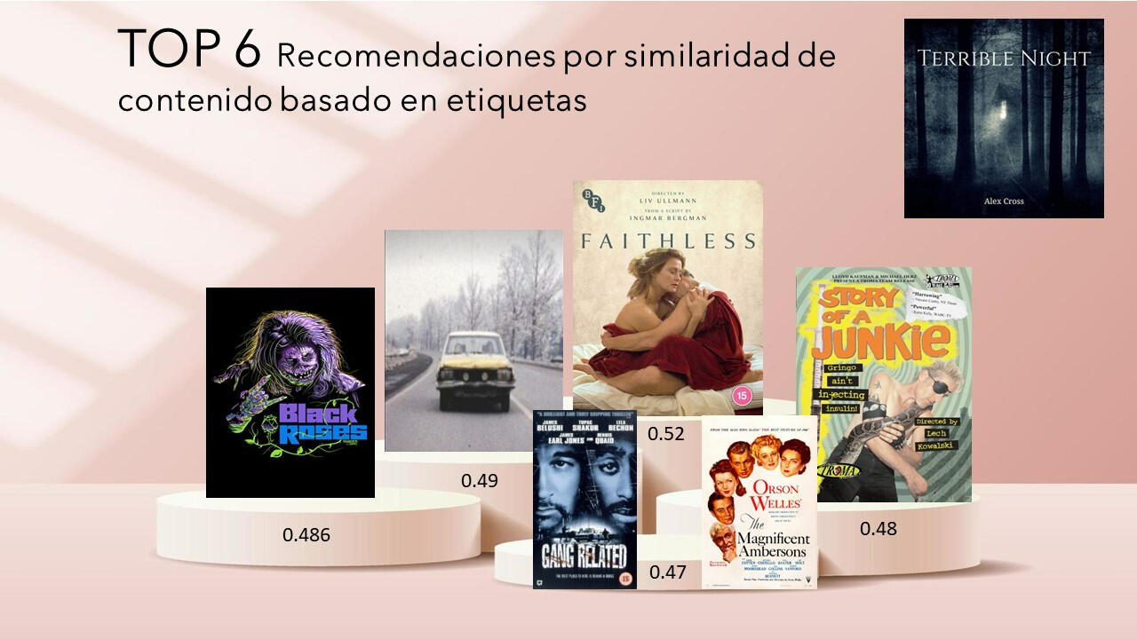 Esta función devuelve los 6 contenidos similares basados en la etiqueta.A continuación se muestran los fragmentos de código mas relevantes para ejecutar la recomendación. (ver Notebook para mas detalle)Calcular la similitud del coseno entre las películas en la matriz de características utilizando la función cosine_similarity de sklearn.Crear una función que tome como entrada el título de una película y devuelva los 6 títulos de películas más similares basados en la similitud del coseno.