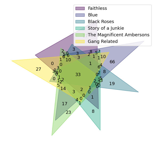 El gráfico de Venn muestra la intersección de los conjuntos de etiquetas de las películas en el dataset de las 6 recomendaciones. La sección donde se superponen representa las etiquetas que tienen en común las 6 películas.El dataset de las 6 recomendaciones contiene conjuntos de etiquetas para cada película, y las etiquetas que tienen en común son `'runaway', 'catastrophe', 'unlikely', 'drama', 'movie', 'storytelling', 'feel-good', 'beautiful', 'melancholic', 'acting', 'great', 'interesting', 'friendships', 'a', 'based', 'death', 'original', 'mentor', 'emotional', 'on', '&', 'story', 'ending', 'scenery', 'life', 'destiny', 'friendship', 'book', 'very', 'good', 'touching', 'not', 'funny'
