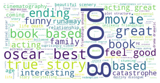 La frecuencia de las etiquetas más comunes en el conjunto de datos muestra que los términos "good", "story", "based", "on" y "oscar" son los más utilizados. Esto sugiere que las películas que contienen estos elementos pueden ser más populares o tener más éxito en la industria cinematográfica. También es interesante notar que términos como "book", "true", "ending", "life" y "acting" también son frecuentes, lo que indica que la audiencia puede tener un interés particular en historias basadas en hechos reales, actuaciones de calidad y finales impactantes. Además, términos como "funny", "drama", "beautiful" y "excellent" también son comunes, lo que sugiere que la audiencia puede tener una inclinación hacia películas con elementos emocionales y visuales atractivos.